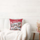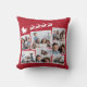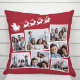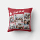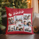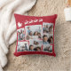 Festive red holiday keepsake pillow featuring a 7 photo collage of scattered pictures in white frames and a white illustration of reindeers flying Santa's sleigh.