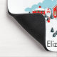 A mouse pad with a digital image of a painted illustration with a red church and steeple. A brigt star shinging overhead. Families out in front arriving for a church service. Winter snow covers the ground and rests on cute bushy pine trees.