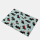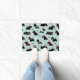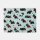 Cute Scottie dogs dressed in festive holiday outfits, Santa hats and argyle sweaters with scattered Christmas ornaments on a blue background.