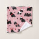 Cute Scottie dogs dressed in festive holiday outfits, Santa hats and argyle sweaters with scattered Christmas ornaments on a pink background.