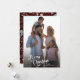 This vertical full photo Christmas card features an elegant modern script. The back side offers space for an additional photo and a personal message and is accented with a boho winter greenery pattern appearing in soft tans and teals on a deep dark burgundy background.