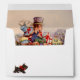 Holiday envelope with an insert of two Victorian Christmas shoppers coming home in the snow with their packages and little Scotty dog. The return address is customisable.