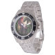 Has heft and feel of expensive stainless steel quartz watches. Good band with safety catch. I removed links, which is easy because engraved arrows show direction to push the linking pins. As always by this seller, the image (a railroad logo) is a perfect reproduction of my emailed image, and is precisely spaced and aligned.