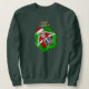 This sweatshirt has the has a skeleton holding up two ornaments to his eyes wearing a red Santa hat inside a green and red abstract splatter shape with the text Merry Christmas in gold.