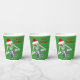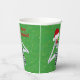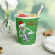 These paper cups are green with tiny gold specks and a fun skeleton holding red and green snowflake covered ornaments up to his eyes wearing a red Santa hat with Merry Christmas text in red on the front and back.
