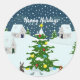 Peaceful snowy night in Christmas village with beautiful Christmas tree in the middle of small houses with pine trees, birds, bunny and squirrel.