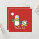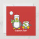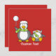 A little penguin cartoon with snowball and a fainted one. Both wearing green scarfs and santa hats.