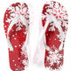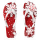 A pair of festive red flip-flops adorned with white snowflakes against a bright background.