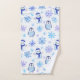 Introducing our Christmas Snowflakes, Snowmen, and Penguins Bathroom Towel Set, a delightful addition to your holiday-themed bathroom decor. This charming set includes a washcloth, hand towel, and bath towel, each featuring a whimsical design with ice blue and purple snowflakes, white and blue penguins, and adorable white snowmen wearing blue hats and scarves. The white background adds a touch of elegance, creating a traditional blue and white Christmas colour scheme that will brighten up your bathroom.