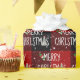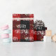 White Merry Christmas font with snowman and pine tree with hat on red and black buffalo plaid with snowflakes.
