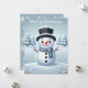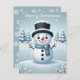 This is a cute Christmas snowman card . There is snow in the background with trees and a light blue colour.