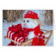 cute snowman in old wooden sled holding a holiday gift with red bow