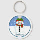 Adorable white Christmas snowman on a winters day. He is wearing a green and red woolly hat and scarf. His eyes are made from shiny black coals and so his is big happy smile. He has an orange carrot for a nose and black coal buttons down his front. Fluffy white snowflakes are falling all around him. Below the snowman is a template in dark blue text to add your name to personalise this Christmas gift.