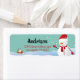 Cute little winter scene featuring happy snowman and little house in a snowy field.
