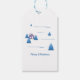 For your Christmas gifts, use this gift tag! It comes with a snowy landscape in a watercolor painting style with fir trees and a purple house and the text Merry Christmas!