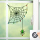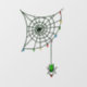 Cute and creepy green decorated spider hangs from his corner web holding an ornament. The spiderweb is covered in bright Christmas lights. Great twist on a traditional holiday image, by Briana Blair.