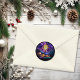 This festive holiday sticker features stained glass nativity scene with north star on a purple background. The perfect envelope seal for your holiday cards.