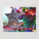 Christmas star postcard with reindeer. Christmas tree and christmas lights in the background.