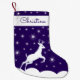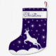 Custom Christmas Stocking.Cute reindeer jumping over white snowdrifts, deep blue night sky with shining stars. Merry Christmas! Trendy hand-written font. Magical Christmas atmosphere. Perfect for all ages and genders. Fits in many styles of Christmas decorating.