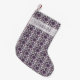 Quilt block in purple and white "spool" pattern. Eight spools rotate around a centre of dark purple. A purple flower print is the "thread" on the spool, as well as the frame for each block. At top is white stripe for area to personalise your name.