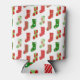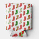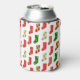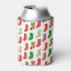 This can cooler has a Christmas design of stockings strewn about with different patterns on them.