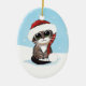 Ceramic keepsake ornament featuring a cute little tabby cat kitten sitting in the snow and wearing a bright red Santa hat. Back of ornament is coloured blue to match the artwork and left blank so it can be customised to add a message. Copyright © Lisa Marie Robinson. All rights reserved. It is illegal to use or duplicate this, or any of our images, without written permission.