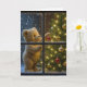 A teddy bear is seen through a snowy window, standing beside a decorated Christmas tree.