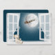 Cute white teddy bear looking at Santa Claus and reindeer flying over the moon.