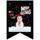 This bunting banner showcases the words "Merry Christmas Ho Ho Ho" in a unique print font with multi-coloured letters and Christmas The Snowman wear red and white with snow falling in the background in this X-mas theme and style. All banners have single sided printing outdoor safe made with sturdy plastic polystyrene and thick plastic rope has (16) 5.5" x 8" swallowtail flags on a 6' long string.