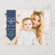 Simple and elegant Christmas Holiday postcard featuring a customizable family picture with a modern indigo blue banner overlay with fun ivory lettering that reads It' Chrismas Time, decorated with greenery and lovely snowflakes.