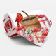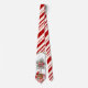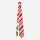 Pretty peppermint striped neck tie with a design of a Christmas topiary, red cardinal, and wrapped Christmas presents.
