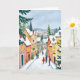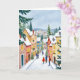 This greeting card features a painted portrait of a quaint down decorated for Christmas.