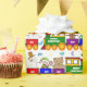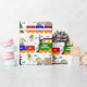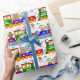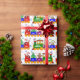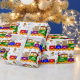Bright and colourful Christmas gift wrap for kids with toy train carrying Santa and friends to spread Holiday Greetings.