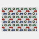 Christmas wrapping paper sheets with a farm theme.  Red, green and blue tractor images, and holiday wreaths make up this pattern.  Each sheet has a different background colour, including light grey, gold yellow and blue.  Perfect for wrapping Christmas gifts for any farmer.