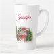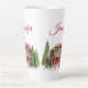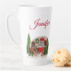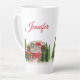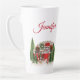 A latte mug with a cute and whimsical Christmas theme. A cosy trailer decorated for Christmas set among some pine trees. Personalise with a name or other text.