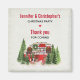 Christmas party thank you magnet with a cute and whimsical Christmas theme. A cosy trailer decorated for Christmas set among some pine trees.