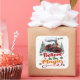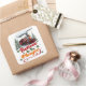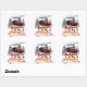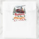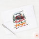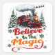 This sticker features a vintage-style red steam train surrounded by snowy pine trees. The train has white smoke billowing from the stack. Santa's sleigh and reindeer are silhouetted against the snow. The large text below reads "Believe In The Magic". The design may look real due to the high detail and three-dimensional texture in the artwork.