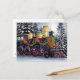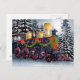 Old fashioned locomotive train decked out in Christmas decorations travelling through snow holiday postcard