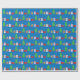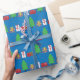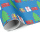 A wrapping paper designed with Christmas trees and gifts on a blue background. Merry Christmas!