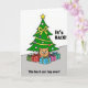 This cute illustration captures a moment of holiday joy with a curious cat. The picture shows a cartoon Christmas tree with a yellow star and pastel ornaments at the top. The tree's branches cascade down, creating a cozy space. A light brown cat peeks out from behind the tree, looking excited with big black eyes and perked ears. The cat has a subtle blush on its cheeks, adding to its charm. Colorful presents at the base of the tree in red, blue, pink, and green with contrasting bows hint at the festive season. The text on the card, "It's BACK!" in the upper right corner and "The best cat toy ever!" at the bottom, adds to the excitement. The white background and grey floor make the scene stand out, creating a warm holiday feel. Share this card to spread holiday cheer and bring smiles to loved ones 🎅🏼🎄🎁.