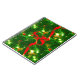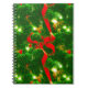 Notebook in a pattern of Christmas tree branches lit with white lights, and decorated with garlands of red ribbon