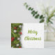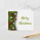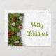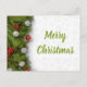 This postcard features green pine tree branches with red and silver baubles and "Merry Christmas" text in matching green font on the front side. Light grey snowflake pattern is in the background on both sides.