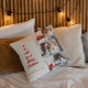 Throw pillow with Christmas tree calligraphy and three photos.