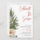 Simple Christmas party invitation featuring a Christmas tree, some candles, ribbon and red modern calligraphy text. Great for a workplace party or to invite friends to celebrate Christmas with you.