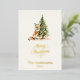 A beige, off-white  background. Decorated with a Christmas tree and a cute fox. Real gold foil on  the front.  Your text and names on the back.  Merry Christmas is written with a hand lettered style font.
