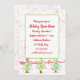 A festive holiday open house invitation decorated with little Christmas trees adorned with red ribbons and ornaments with red ribbon banners and a watercolor spatter border. Nice for gathering friends and family at Christmastime!