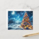 This design features a beautifully, illuminated Christmas tree covered in snow, sparkling with warm lights and vibrant red and blue ornaments, under a starry sky and a crescent moon.