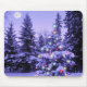 Purple with highlights of rose and white. Lighted Christmas tree at night in the snowy forest by moonlight.