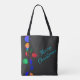 Christmas Tree, Multi-coloured lights, bokeh Tote Bag - A two sided rugged tote with a night time theme. A Christmas Tree with multi-coloured lights photographed at night, gives off a lovely bokeh glow. It looks a bit blurry, but that's the bokeh effect. The opposite side is a very close up of a Christmas bulb string with the bokeh effect behind the bulb. The text, Merry Christmas, is completely customisable. It's a lovely two sided bag great for gift giving and can also be used as the reusable gift bag to tote some gifts to your friends.