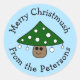 A cartoon mushroom with a green cap like a Christmas tree wishes a "Merry Christmush" from the family.